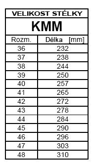 Svršek je ušit ze silné hovězí usně, ve špici je vložena ocelová kaple. Odolná originální polstrovaná podrážka KMM The original boots o výšce 2 cm, podpatek má výšku 3,5 cm, s výrazným vzorkem, nerezovými šrouby a logem výrobce. Trojité švy zaručují dlouhodobou odolnost. Oproti vzhledově podobným botám jiných výrobců se obuv KMM vyznačuje vysokou jakostí použitých materiálů, precizním zpracováním a opravdu dlouhou životností. V každém balení najdete i jedny náhradní šňůrky.